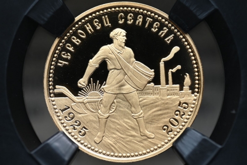 Червонец Сеятель 2025г.,Золото, "К 100-летию чеканки пробного Червонца 1925г." в слабе ННР PROOF