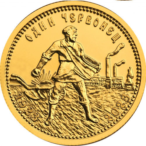 Первая золотая монета Советского Союза, выпущенная в рамках денежной реформы по укреплению национальной валюты в 1923 году. До этого года у страны было много потрясений, основные из которых — Гражданская война, смена режима правления и мироустройства. Все эти события породили дикую инфляцию в стране. На монете изображен рабочий переходящий с поля на завод — главный двигатель развития — индустриализацию. Выпуск монет был произведен по Николаевскому стандарту — 8,6 грамм, золото 900 пробы. Монет было выпущено достаточное количество, а иностранные партнеры отказались их принимать. Поэтому было принято решение переплавить монеты в царские червонцы, в основном 1898, 1899, 1900, 1901 годов. Что привело к тому, что сейчас червонец Сеятель 1923 года стоит в несколько дороже царского червонца.