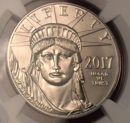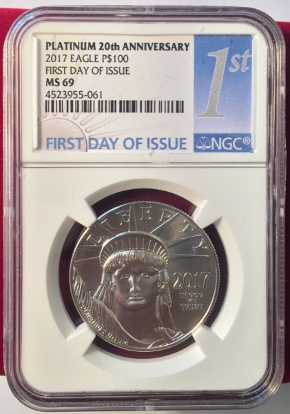 • Платиновая монета США «Юбилейный Американский Орел» 2017 года выпуска посвящена 20-летнему юбилею монетной платиновой программе «Американский Орел». На этой монете изображен портрет Статуи Свободы. В слабе авторитетной американской грейдинговой компании NGC с грейдом MS69 FIRST DAY OF ISSUE (Первый день выпуска монеты).