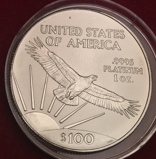 • Аверс: Изображен орел в полете на фоне восходящего из-за линии горизонта солнца и его лучей. Сверху стоит надпись в две строки: «UNITED STATES OF AMERICA» (Соединенные Штаты Америки). Справа сверху от орла находятся следующие обозначения в три строки: «.9995 PLATINUM 1 OZ.» (проба 0.9995, платина, 1 унция). На стилизованном изображении земли внизу стоит информация о номинале: «$100» (100 долларов).