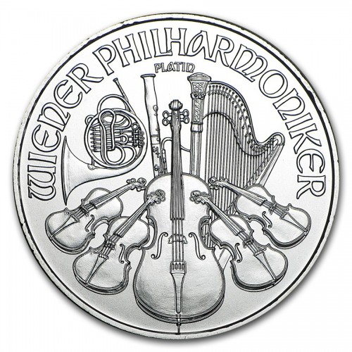 • На реверсе платиновой монеты австрийский Филармоникер изображены различные музыкальные инструменты, такие как контрабас, виолончели, скрипки, фагот, арфа и труба. Сверху надпись – WIENER PHILHARMONIKER