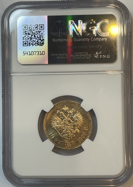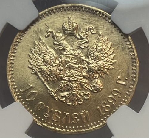 Золотая монета 10 рублей Николай II 1899г.,АГ, в слабе NGC MS 66