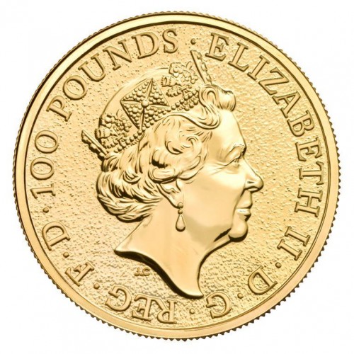 На аверсе золотой инвестиционной монеты "Грифон Эдуарда III" - портрет Ее Величества Королевы Елизаветы II, выполненный Джоди Кларком, представленный на британских монетах с 2015 года (так называемый пятый тип монетного портрета королевы). По краю монеты расположены надписи, указывающие номинал монеты и имя Королевы: 100 POUNDS / ELIZABETH II / D / G / REG / F / D