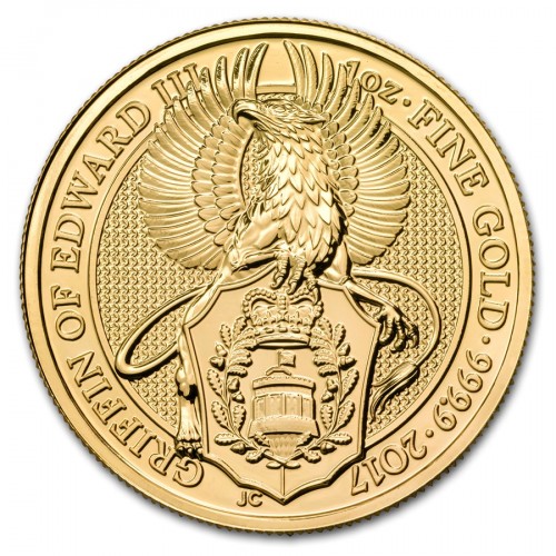 На реверсе золотой инвестиционной монеты "Грифон Эдуарда III" - изображение грифона с расправленными крыльями, держащего в лапах щит. По кругу монеты - надписи на английской языке, обозначающие "Грифон Эдуарда III", 1 тройская унция чистого золота 999,9 пробы. Далее идет год выпуска монеты - 2017. Снизу, под изображением грифона, указаны инициалы дизайнера монеты - JC (Jody Clark).