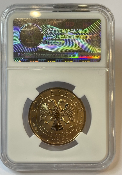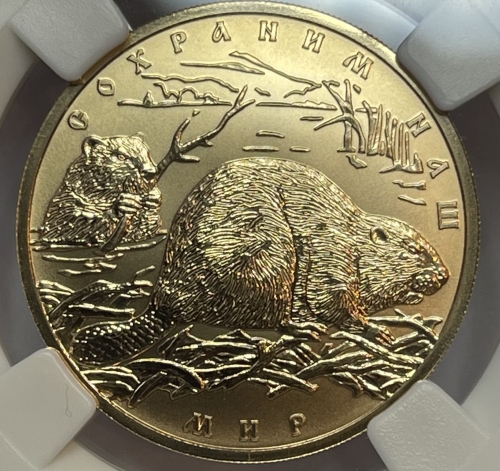 Золотая монета 100 рублей Бобр в слабе ННР MS 70