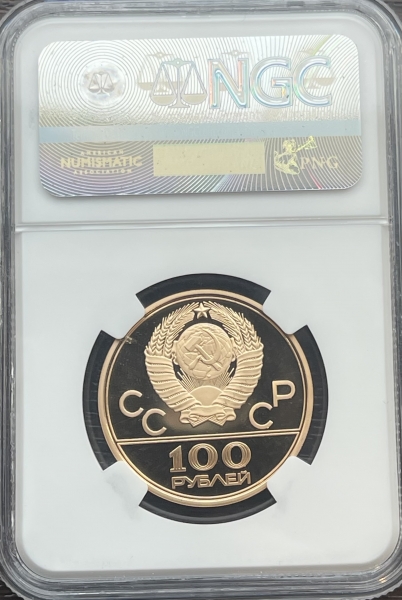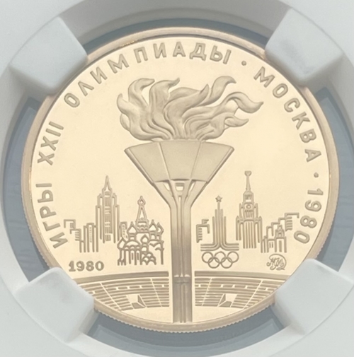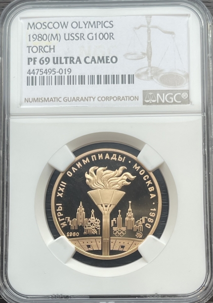 Золотая монета 100 рублей "Олимпийский огонь" 1980г. ММД В слабе NGC PROOF 69 ULTRA CAMEO