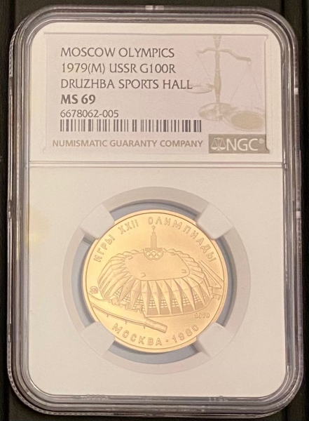 Золотая монета 100 рублей "Спортивный зал Дружба" Олимпиада 80, 1979г., в слабе NGC MS 69