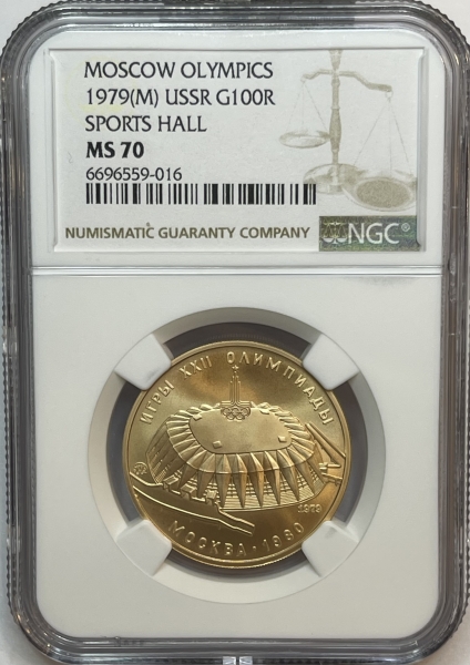 Золотая монета 100 рублей "Спортивный зал Дружба" Олимпиада 80, 1979г., в слабе NGC MS 70