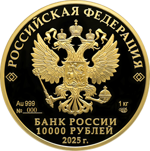 На лицевой стороне монет расположено рельефное изображение Государственного герба Российской Федерации, имеются надписи: «РОССИЙСКАЯ ФЕДЕРАЦИЯ», «БАНК РОССИИ», номинал монет «3 РУБЛЯ», «50 РУБЛЕЙ», «100 РУБЛЕЙ», «10000 РУБЛЕЙ», дата «2025 г.», обозначение металла по Периодической системе элементов Д.И. Менделеева, проба сплава (проба), товарный знак Санкт-Петербургского монетного двора и масса драгоценного металла в чистоте. На лицевой стороне золотой монеты номиналом 10 000 рублей в нижней части рядом с надписью, обозначающей массу драгоценного металла в чистоте, расположен порядковый номер монеты с указанием знака «№».