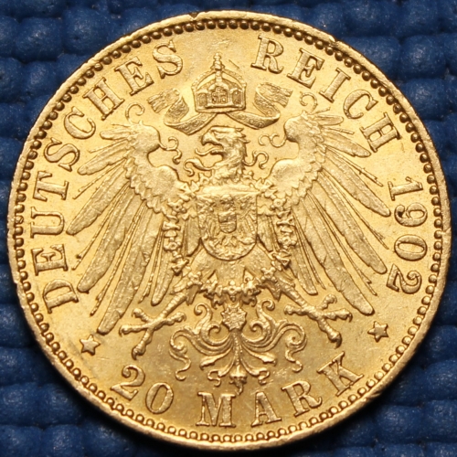 Реверс: Изображение герба Германии - коронованного орла с распростертыми крыльями. Над императорским орлом круговая надпись: "DEUTSCHES REICH 1911". Нижняя круговая надпись: "* 20 MARK *".