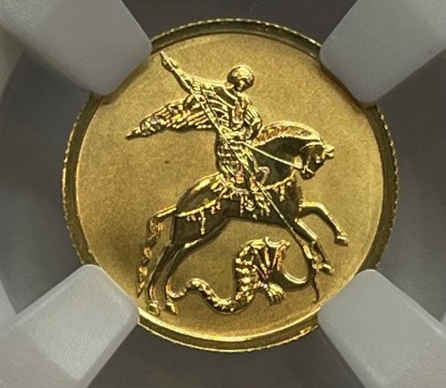 Золотая монета 25 рублей "Георгий Победоносец" 1/10 унции , 2023г., 3,11г., Au 999 В СЛАБЕ ННР MS 70