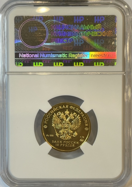 Золотая монета 10 рублей "Червонец Сеятель" ММД в слабе ННР MS 70, 2023 г.