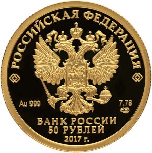 на зеркальном поле диска – рельефное изображение Государственного герба Российской Федерации, над ним вдоль канта – надпись полукругом: "РОССИЙСКАЯ ФЕДЕРАЦИЯ", обрамленная с обеих сторон сдвоенными ромбами, внизу под гербом: слева – обозначения драгоценного металла и пробы, справа – содержание химически чистого металла и товарный знак монетного двора, внизу в центре в три строки – надпись: "БАНК РОССИИ", номинал монеты: "50 РУБЛЕЙ", год выпуска: "2016 г."