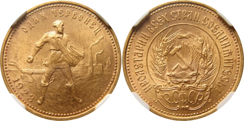 Одновременно с выпуском бумажных червонцев, в октябре 1922 года было принято решение о выпуске золотых червонцев в виде монет. По своим весовым характеристикам (8,6 г, 900 проба) и размерам червонец полностью соответствовал дореволюционной монете в 10 рублей. Автором рисунка стал главный медальер монетного двора АФВасютинский (также автор окончательного варианта ордена Ленина и первого значка ГТО). На аверсе монеты был изображён герб РСФСР; на реверсе — крестьянин-сеятель, выполненный по скульптуре ИДШадра (натурщиками были два крестьянина деревни Праговая Шадринского уезда Перфилий Петрович Калганов и Киприян Кириллович Авдеев), ныне находящейся в Третьяковской галерее. Монета была отчеканена на Петроградском монетном дворе в 1923 году тиражом 2 751 000 экземпляров.[3]
