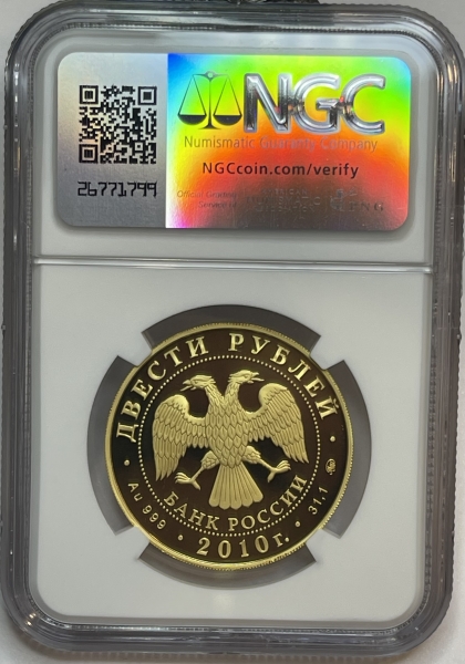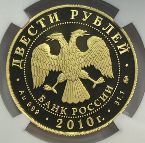 • Аверс: в центре - эмблема Банка России (двуглавый орёл с опущенными крыльями, под ним - надпись полукругом "БАНК РОССИИ"), обрамленная кругом из точек и надписями по кругу - вверху: "ДВЕСТИ РУБЛЕЙ", внизу: слева - обозначения драгоценного металла и пробы сплава, в центре - дата выпуска "2010 г.", справа - содержание химически чистого металла и товарный знак монетного двора.