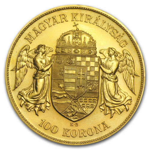 Реверс: Изображение герба Венгрии - щит, поддерживаемый двумя ангелами, венчает корона святого Стефана. Верхняя круговая надпись: "MAGYAR KIRALYSAG". Нижняя надпись - номинал золотой монеты: "100 KORONA".